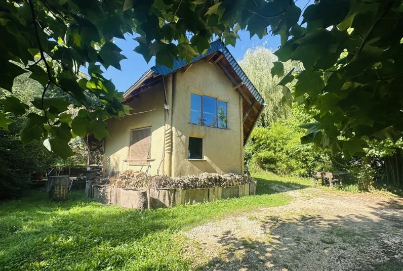 Maison individuelle de 74m² en forme de proue de bateau (6 côtés) avec une terrasse de 20m², une dépendance aménagée de 15m² , une seconde à usage d’atelier de 25m² sur un terrain de 2210m² supportant une retenue d’eau de source de 35m² ainsi que des essences rare comme le Tulipier de virginie, le poivrier Timut/Sichuan et des fruitiers.